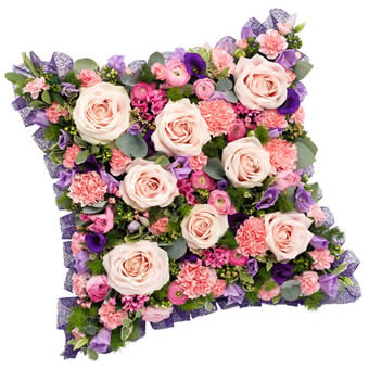 Een prachtig vierkant kussen, opgestoken met roze rozen, anjers, lila en paarse accenten, afgewerkt met decoratief gaaslint. Een stijlvol en liefdevol bloemstuk, geschikt om een dierbare te eren.