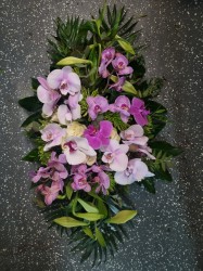 Een elegant rouwstuk in zachte paarstinten, met luxe orchideeën die schoonheid en verfijning uitstralen. Een stijlvol eerbetoon voor een geliefde met een bijzonder karakter.