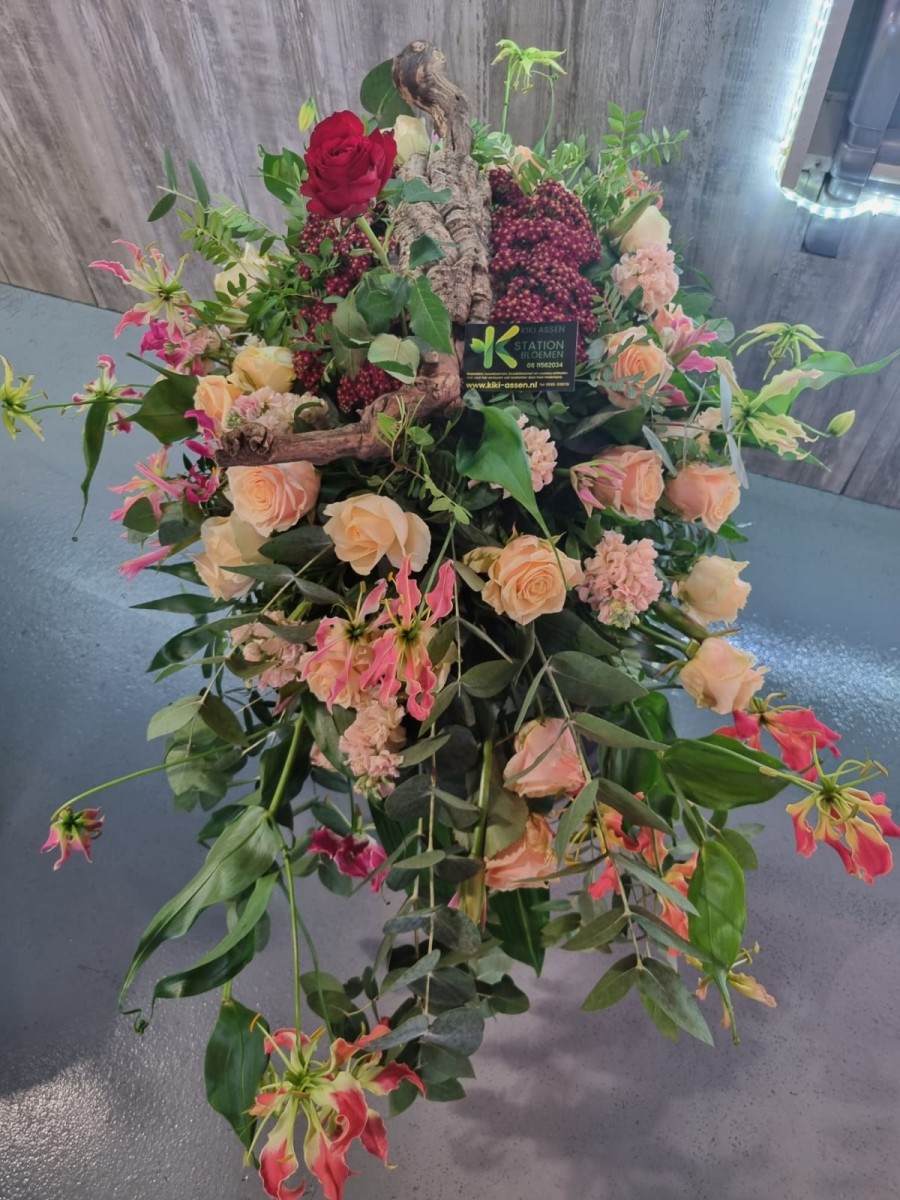 Een speels en warm rouwstuk met een combinatie van zachtroze, dieprode en vurige bloemen. Een levendig eerbetoon aan een kleurrijk en liefdevol leven.
