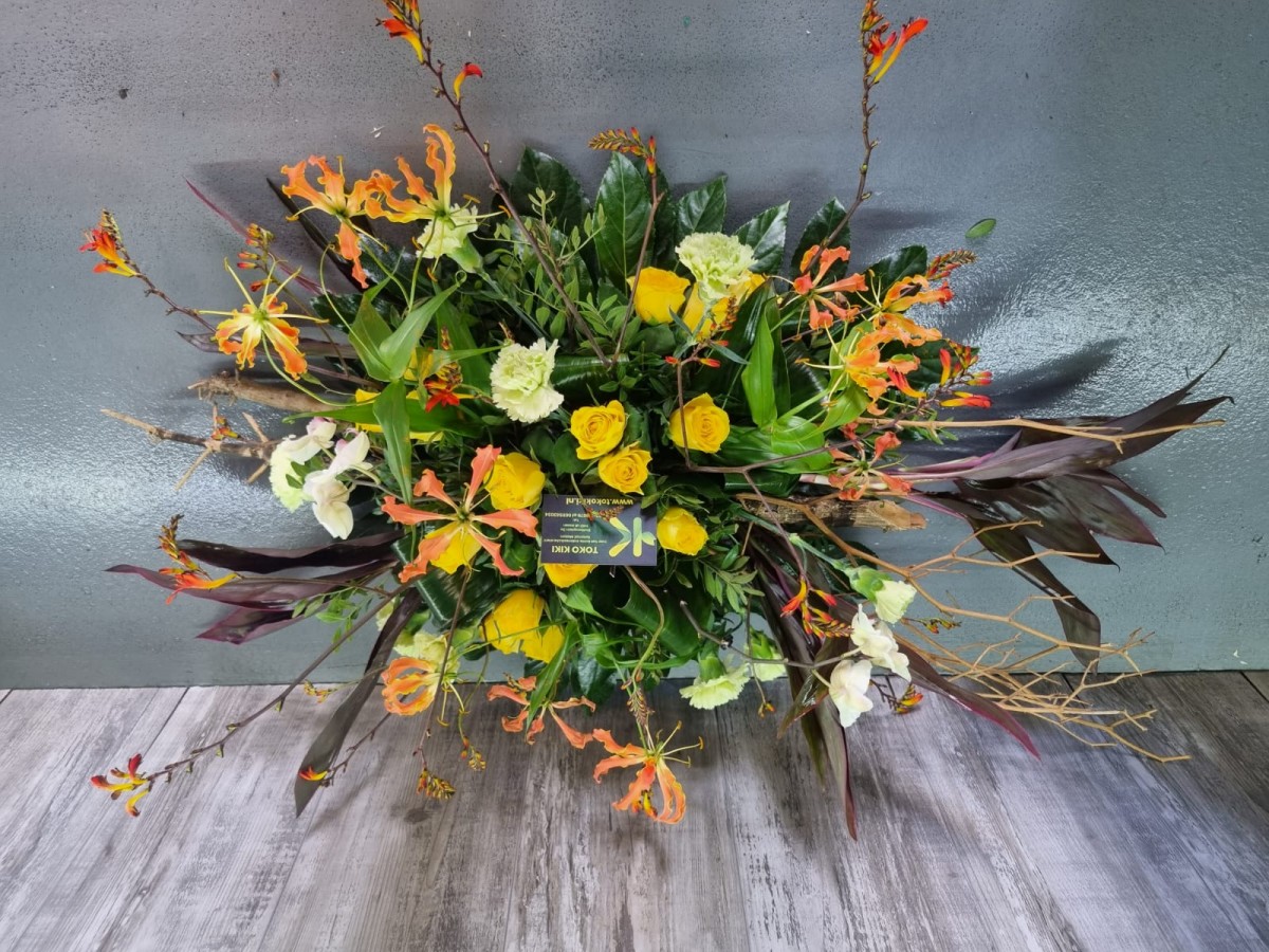 Een krachtig en levendig bloemstuk dat het leven viert en troost biedt in donkere tijden.