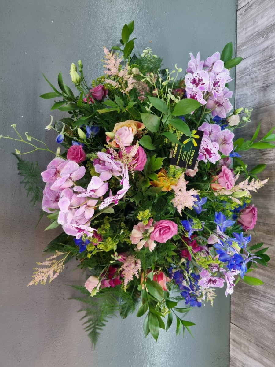 Een luchtig en kleurrijk bloemstuk dat sereniteit en liefdevolle herinneringen samenbrengt.