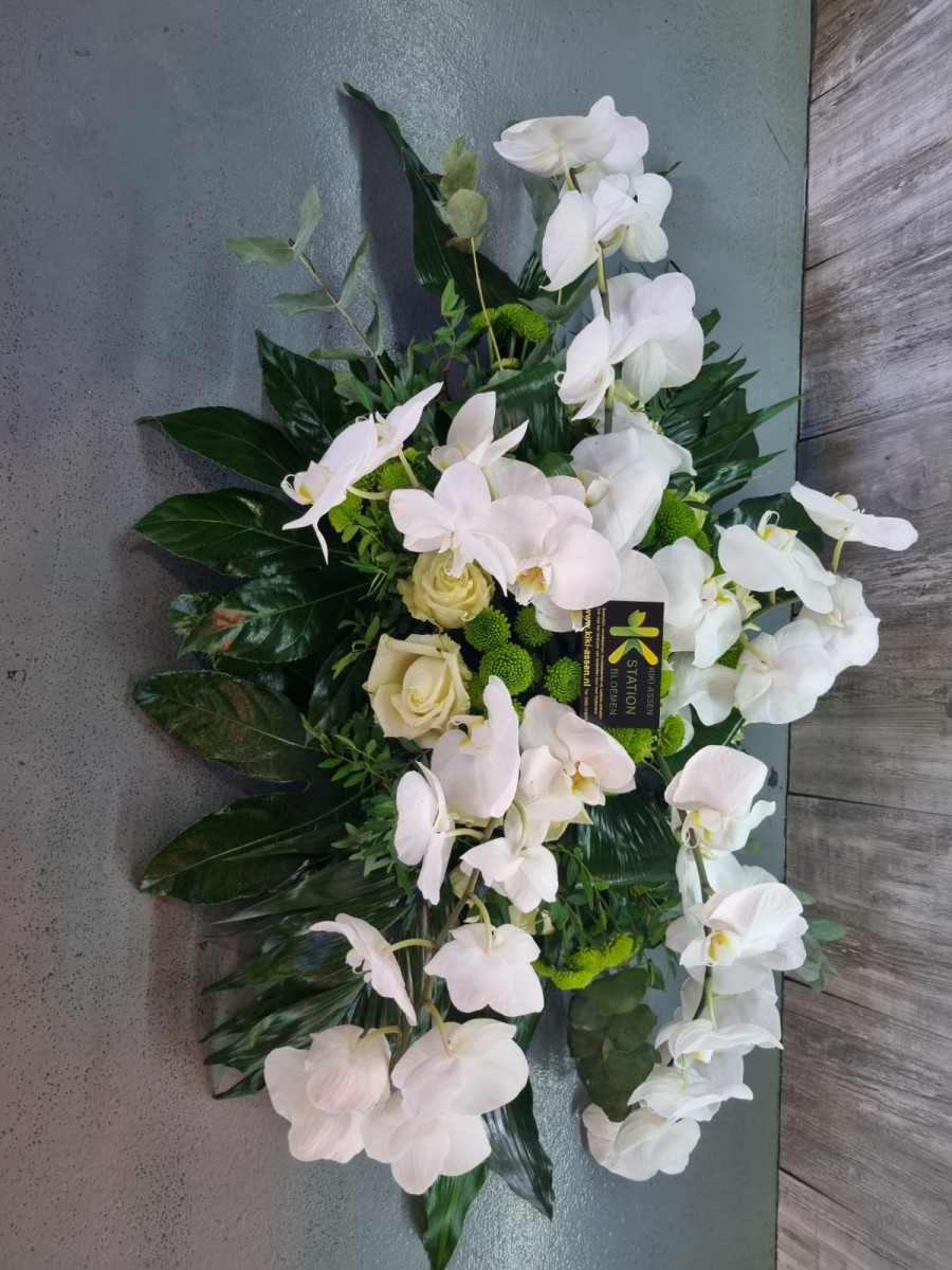 Een stijlvol en sereen bloemstuk dat rust en zuiverheid uitstraalt.