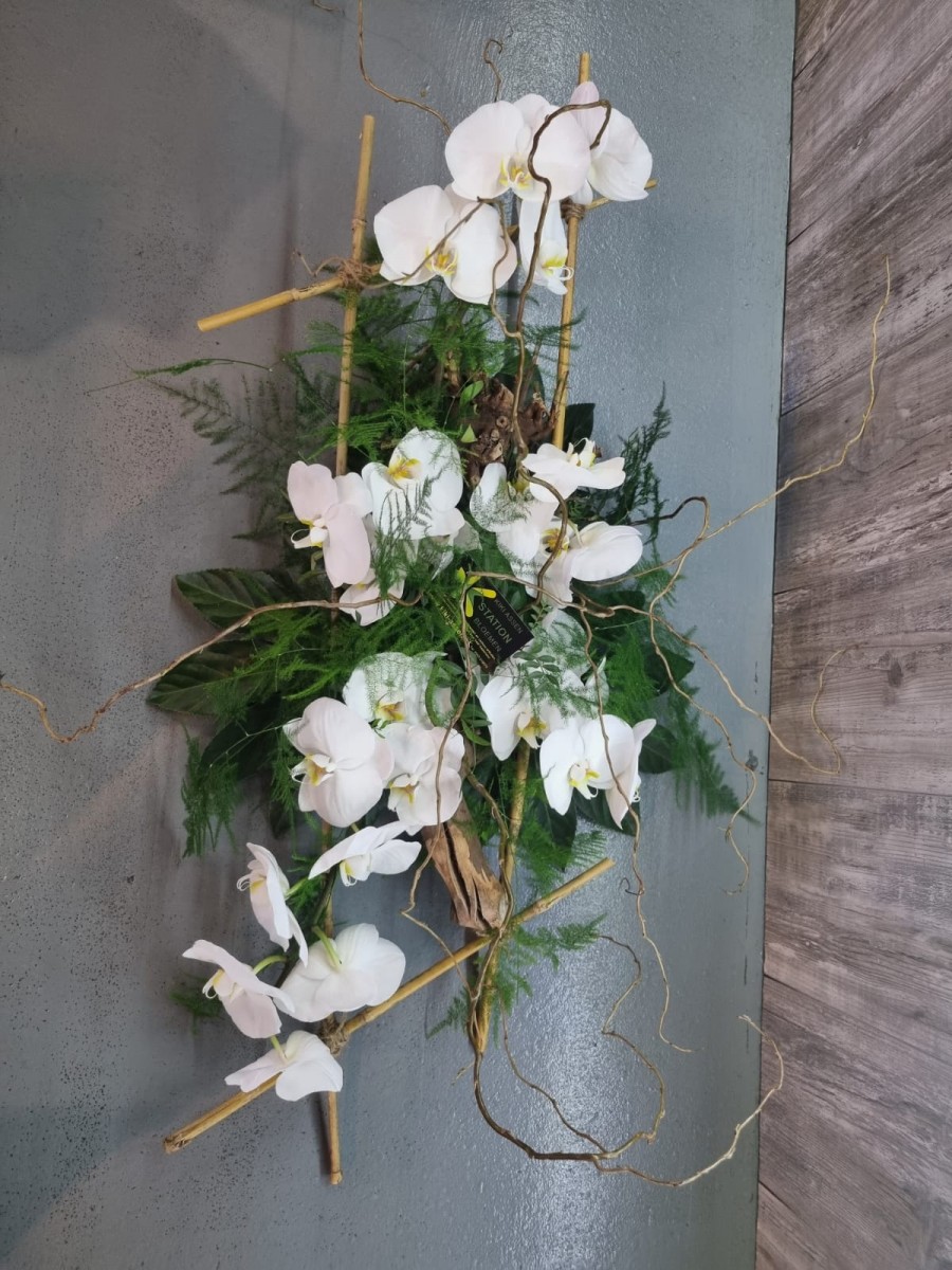 Een ingetogen, modern rouwarrangement symbolisch bloemstuk met natuurlijke elementen voor een sereen afscheid.